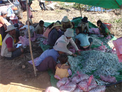 There is a small island at the centre of the village which has a bustling market and one of several Pagodas, a School and Health Centre. The Pagoda has a brightly coloured painting outside the entrance; depicting Heaven and a rather gory Hell; depicted very graphically. There are also carved stones from the remains of an Angkorian Temple which was once on this site.